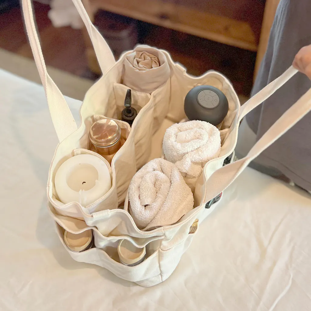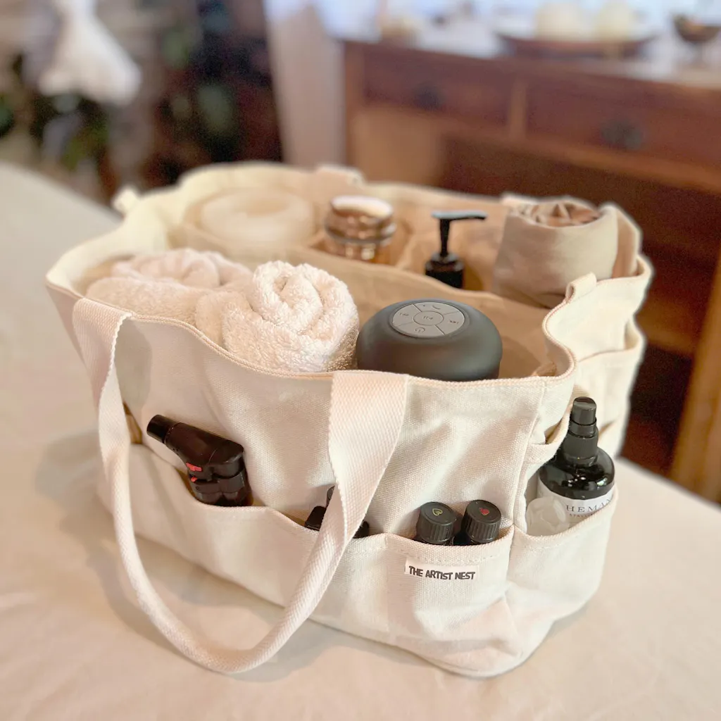 Mobile massage therapists, energy workers, and holistic practitioners who travel to clients. Essential oil bottles standing upright in internal compartments. Treatment tools organised in external pockets. Client records and intake forms in central area. The white canvas conveys cleanliness, professionalism, and mindful practice.