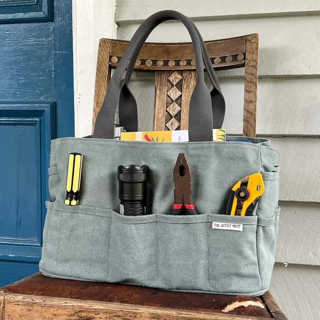 The Eucalypt is a spacious canvas tool bag with plenty of pockets, designed for artists and makers who need serious organisation. This multi-pocket artist bag features an innovative dual-pocket system with 18 external pockets and 9 internal compartments, creating 27 pockets total for complete tool organisation.